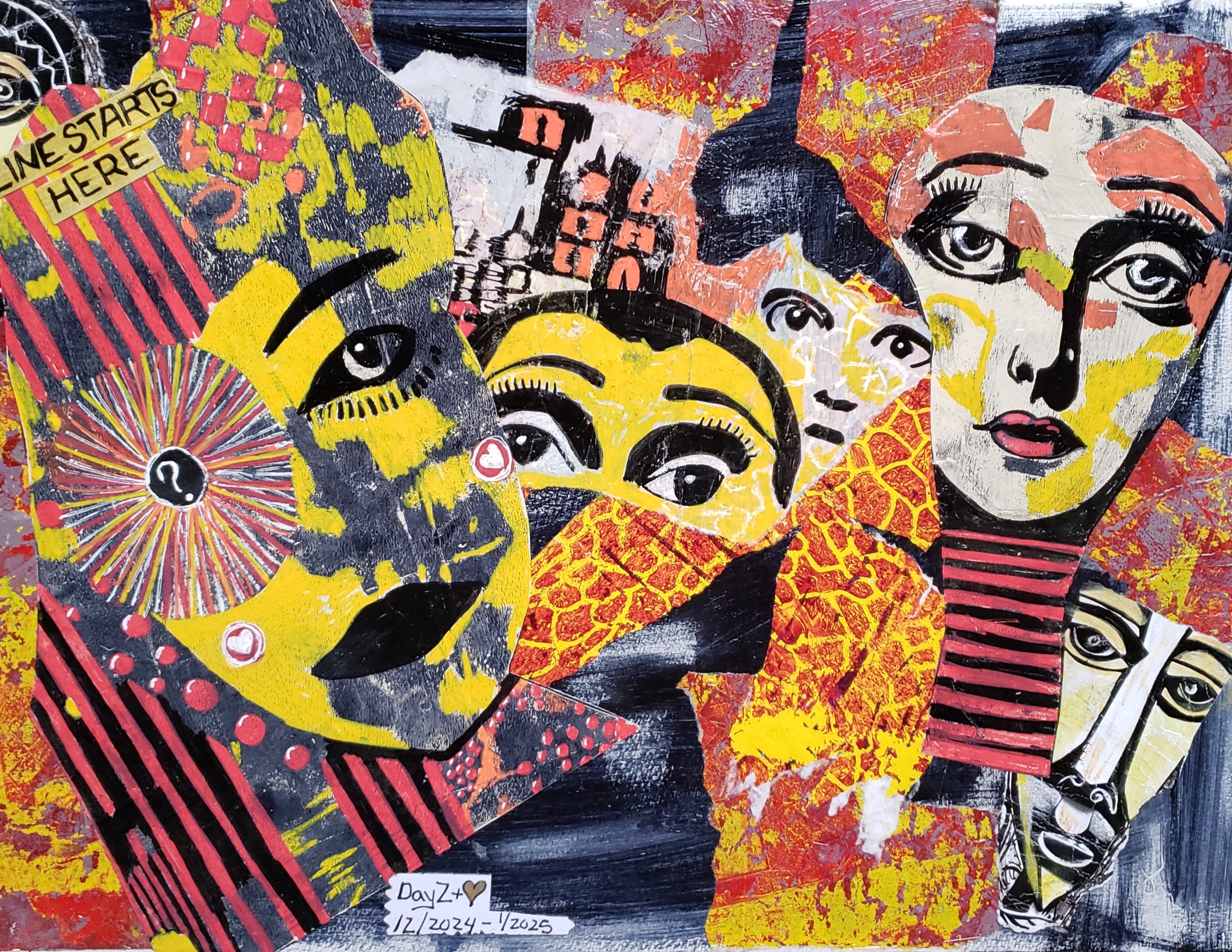 This was a true collage. I first came up with the faces then the collage papers that I had been keeping fit perfectly. The faces were inspired by another piece of art.