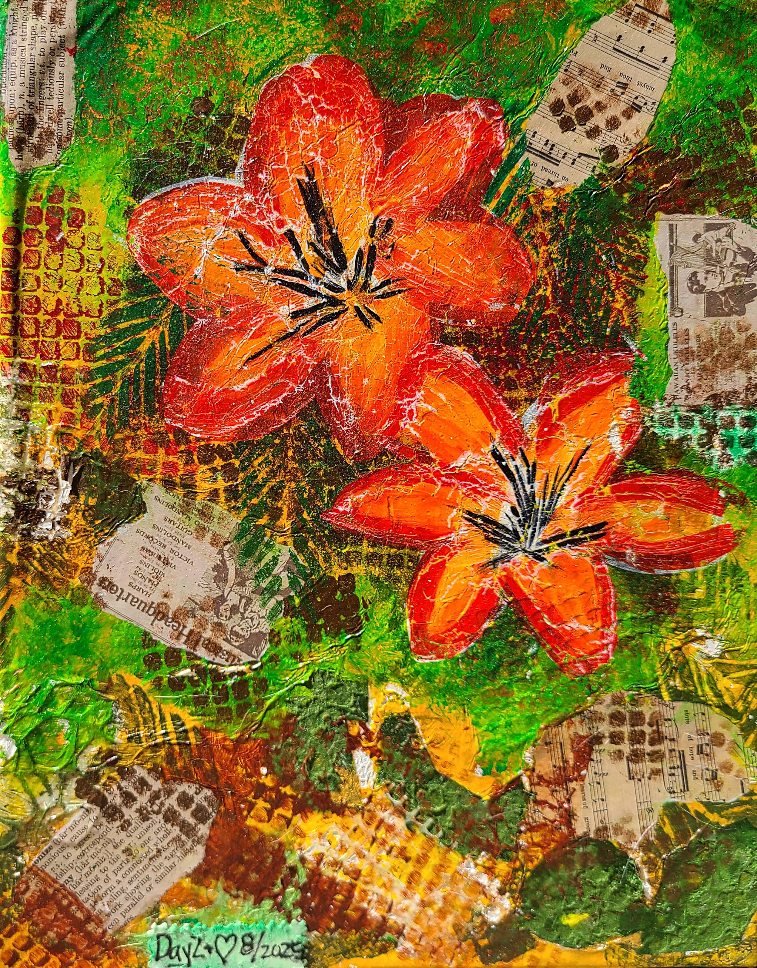 I used transfers of a picture of some flowers on a gel plate. Made those flowers mine. I added collage elements and pulled it off the plate. It was fun!