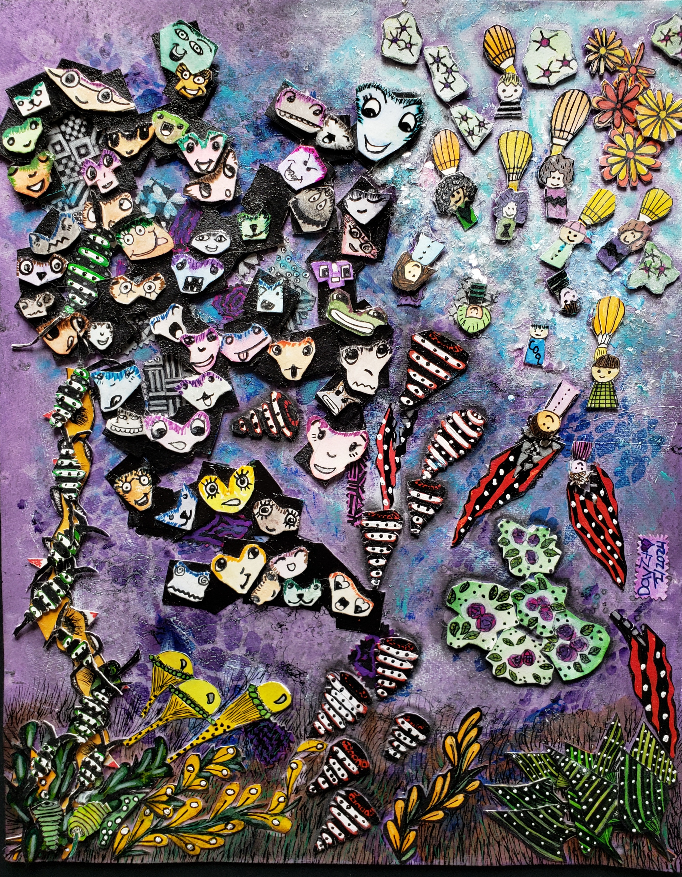 The faces came to me. Random face parts from the internet. Inspired. Mixing elements. The little bugs came. I started this piece not knowing where I was going. I trusted myself and the process.